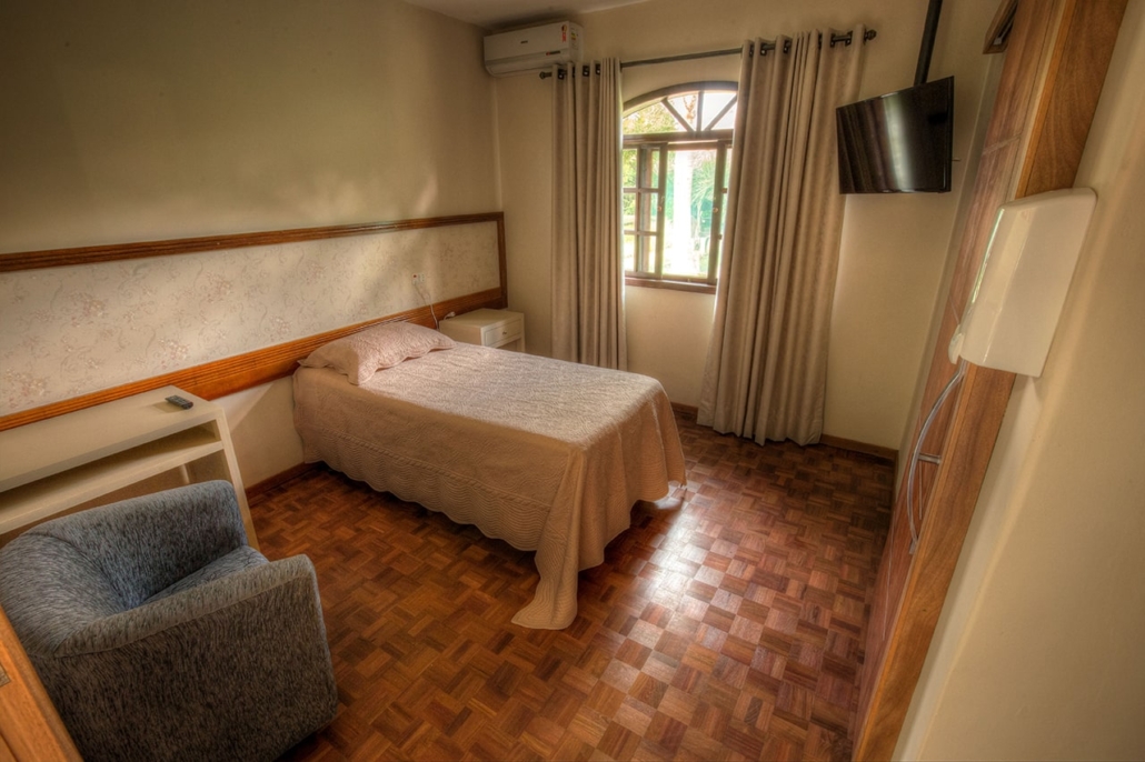Em cada uma das 17 suítes (15 individuais e 2 para casal) do Bosque Residencial Sênior é ofertado ao morador(a) o conforto necessário para bem viver. As suítes dispõem de cama de solteiro ou casal confortável, na altura ideal para as necessidades dos residentes; armários, poltronas e mesa de apoio; ar condicionado; televisão de Led; e aparelho telefônico.